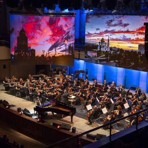 Специалисты нашей компании смонтировали на сцене Концертного зала Омской филармонии, где проходило мероприятие, огромные светодиодные экраны, ставшие одним из основных визуальных элементов шоу.